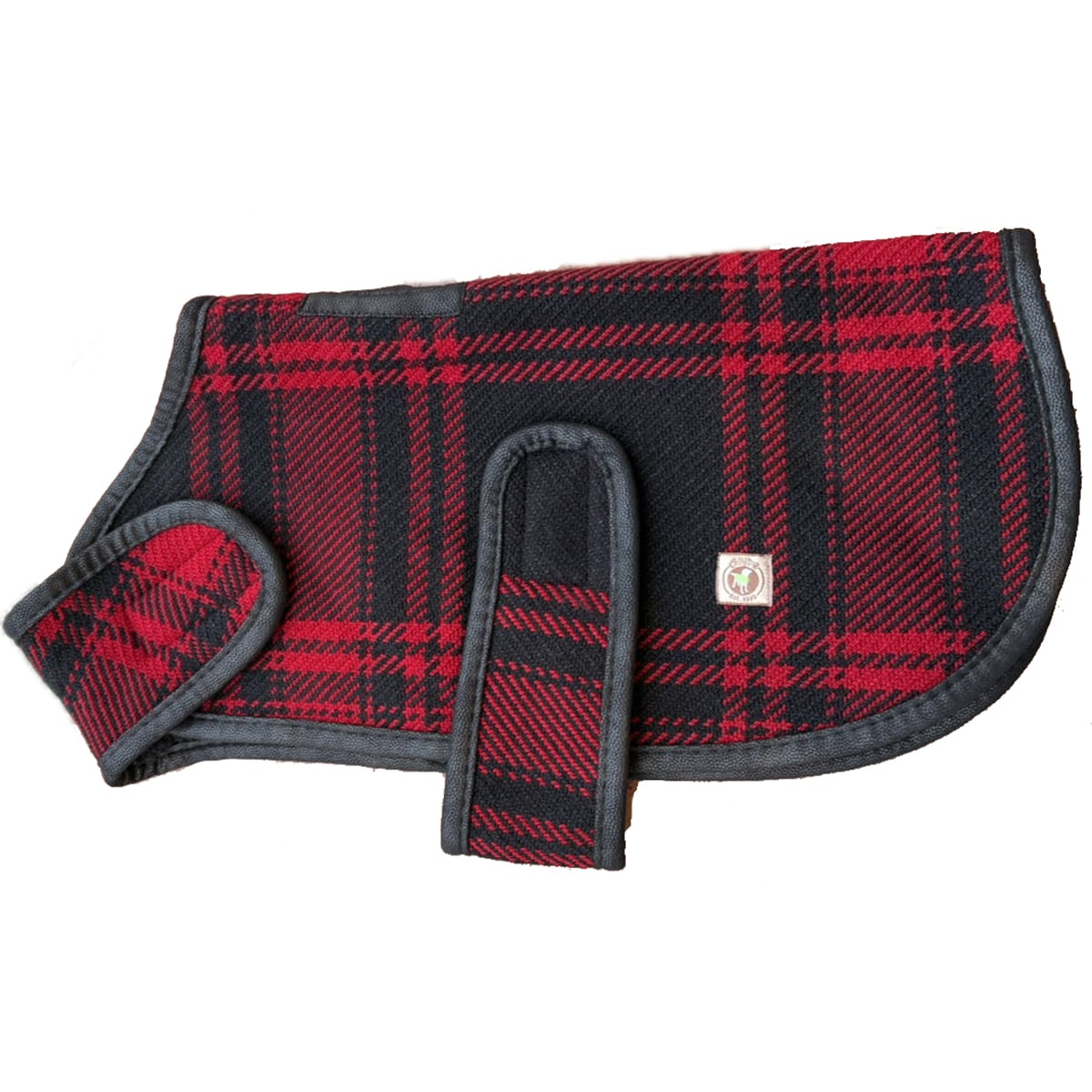 グレー、ブラック、ホワイト、レッドチェック柄のドッグブランケットコートです。