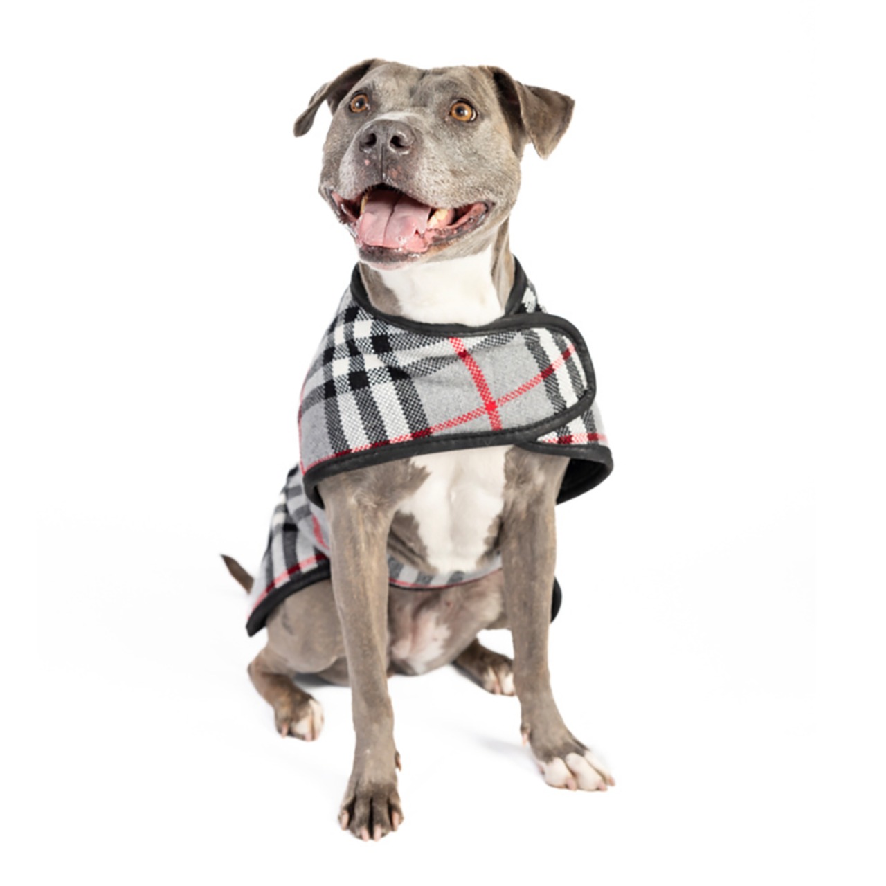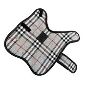 グレー、ブラック、ホワイト、レッドチェック柄のドッグブランケットコートです。