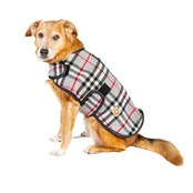グレー、ブラック、ホワイト、レッドチェック柄のドッグブランケットコートです。