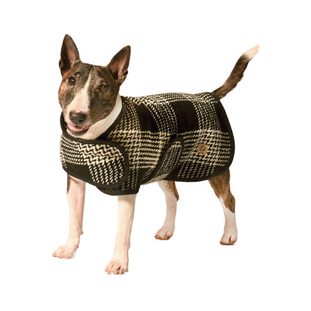 黒と白のチェック柄のドッグブランケットコートは時代を超越したクラシックです。