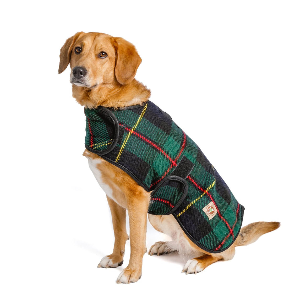 クラシックなネイビー、レッド、グリーンのチェック柄ドッグブランケットコートです。