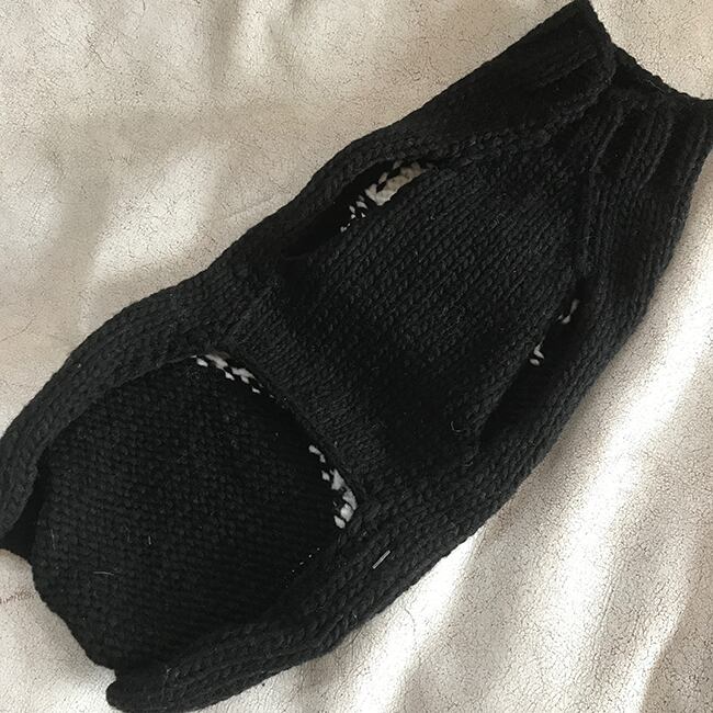 ウール100%の極太の毛糸で詰んで整った編み目と、しっとりとした重みが秀逸で、ハンドニットならではのぬくもりがあります。