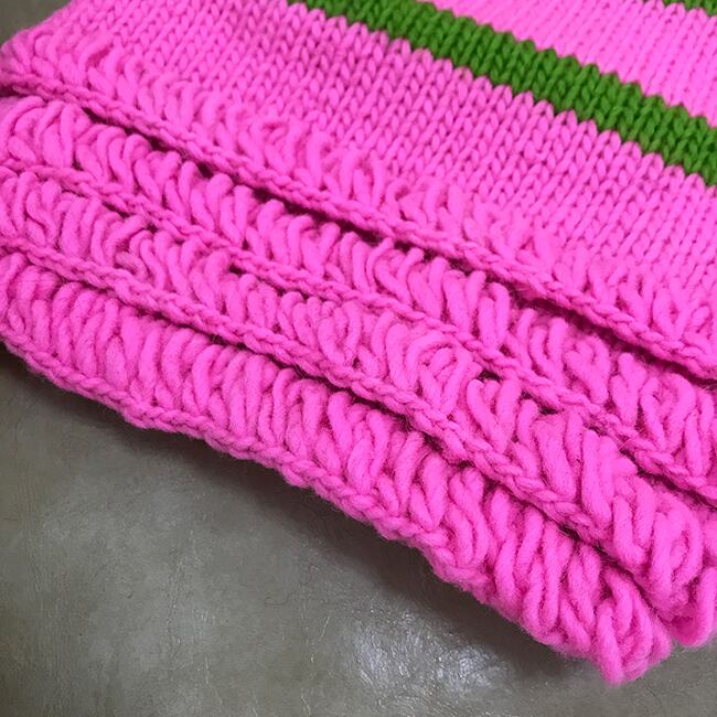 ウール100%の極太の毛糸で詰んで整った編み目と、しっとりとした重みが秀逸で、ハンドニットならではのぬくもりがあります。